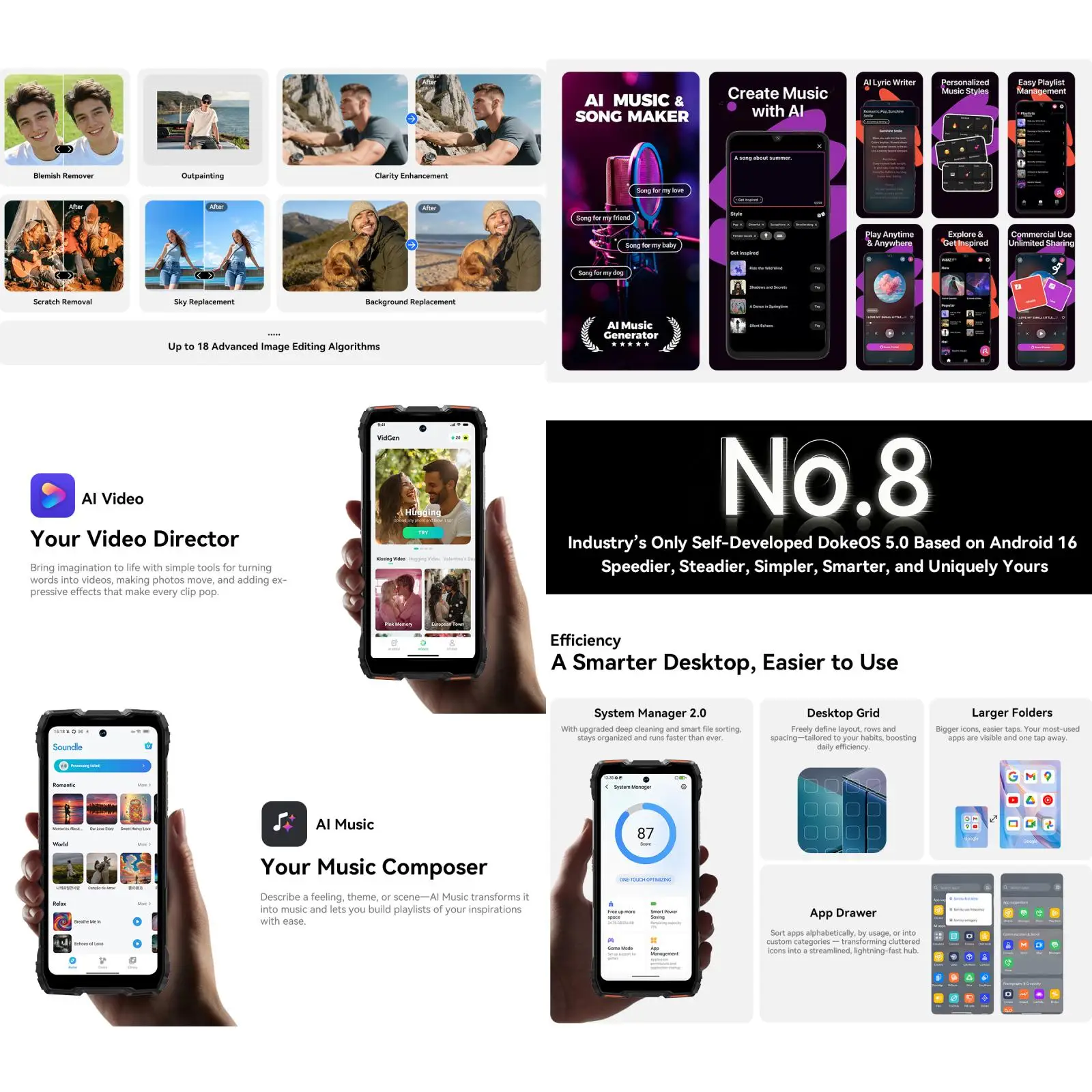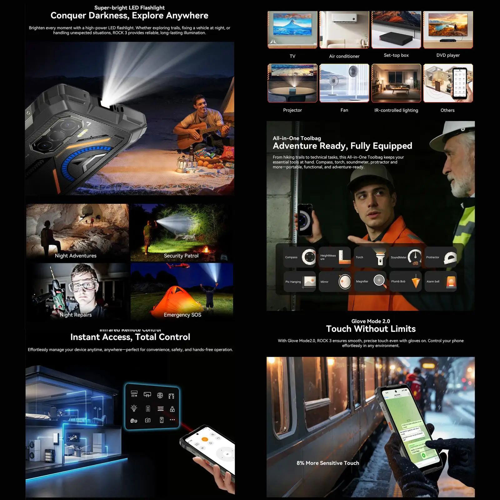 Blackview ROCK 3 пропонує повний набір сучасних технологій для зв'язку та роботи: модуль NFC для безконтактних платежів, надточну систему навігації (GPS, GLONASS, Beidou, Galileo). Мультимедійні можливості підсилені потужними стереодинаміками Smart-PA з об'ємним звуком та унікальним професійним ліхтарем на 400 люмен, що має режим SOS. Додатковий комфорт забезпечують швидкий сканер відбитків пальців, програмована бічна кнопка для миттєвого доступу до функцій та повноцінний набір цифрових інструментів (компас, шумомір, рівень), що робить пристрій незамінним помічником у будь-яких екстремальних умовах.