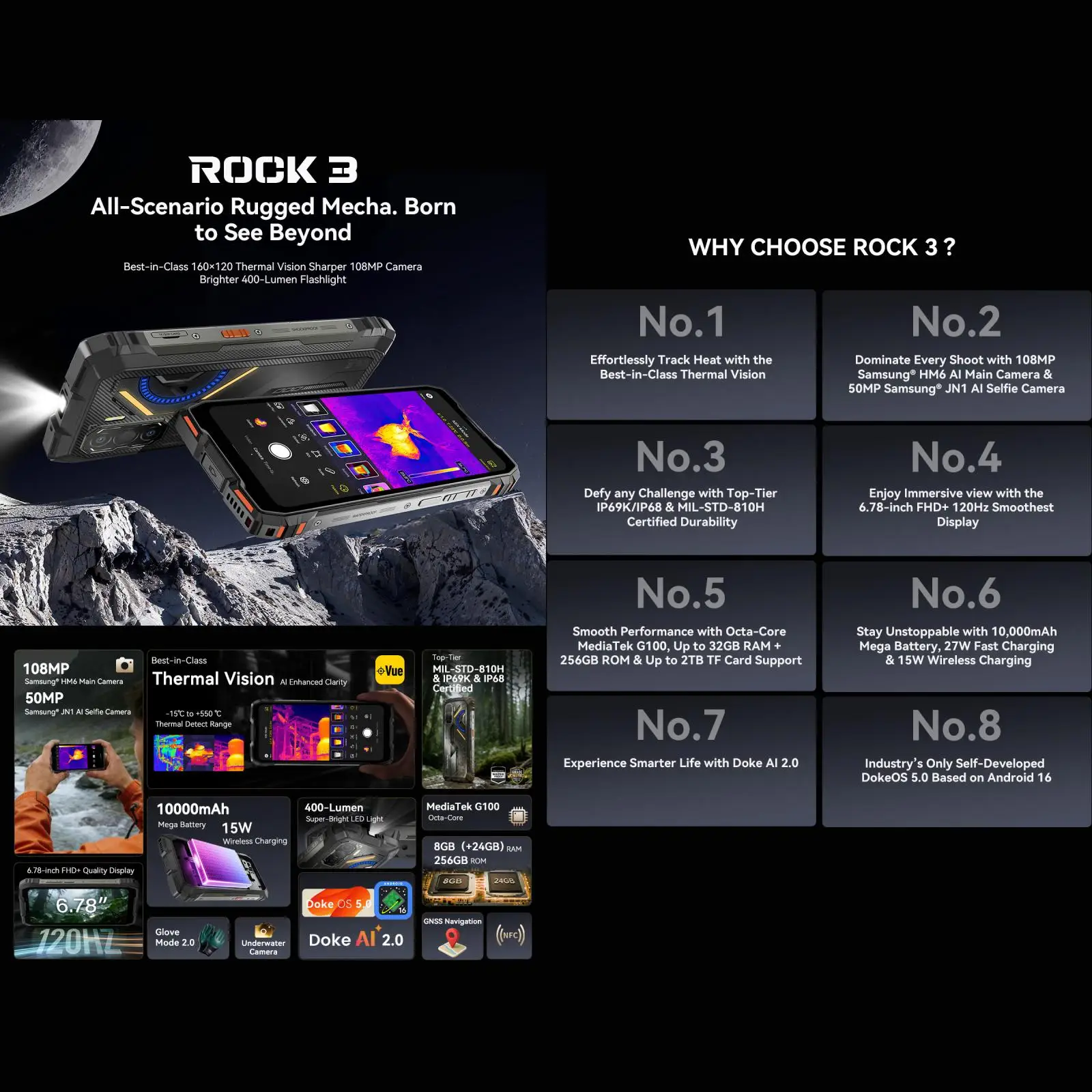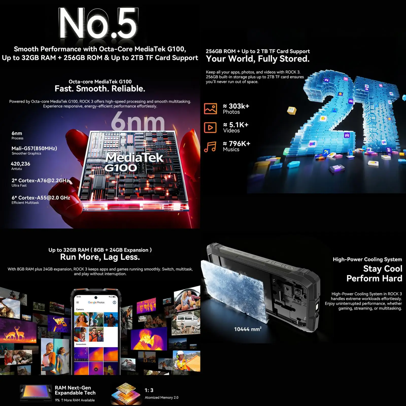Щодо пам’яті, ROCK 3 пропонує безкомпромісні можливості для багатозадачності. На борту встановлено 8 ГБ фізичної оперативної пам'яті стандарту LPDDR4X, яку можна розширити до вражаючих 24 ГБ за рахунок технології віртуального розширення RAM (додаючи до +16 ГБ зі сховища). Внутрішнє сховище об'ємом 256 ГБ формату UFS дозволяє зберігати величезні бібліотеки фото, відео та карт. Якщо ж цього недостатньо, смартфон підтримує карти пам'яті microSD неймовірною ємністю до 2 ТБ, що фактично робить його мобільним дата-центром у вашій кишені.