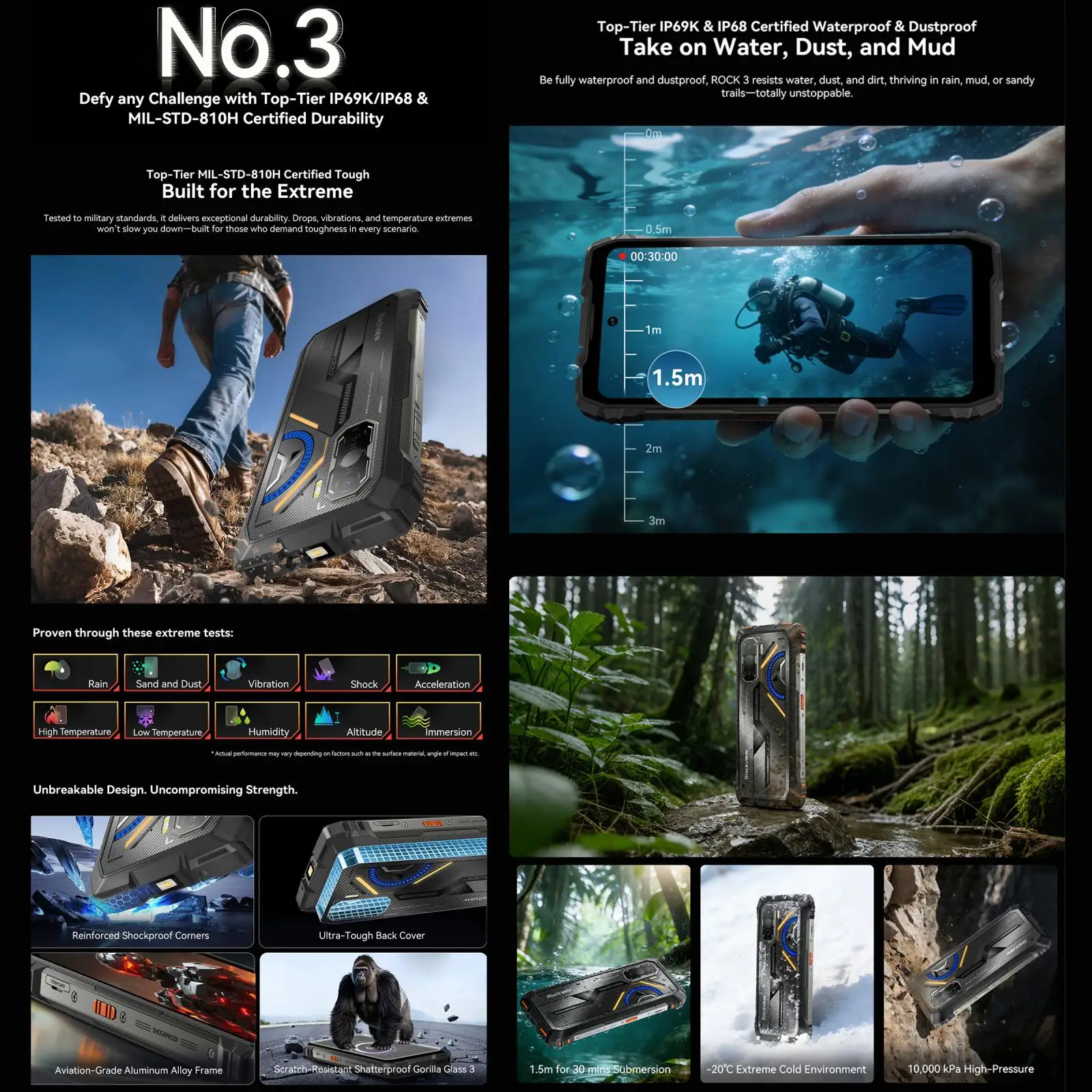 Blackview ROCK 3 — це надміцний смартфон нового покоління, створений для тих, хто працює чи відпочиває в екстремальних умовах. Корпус пристрою розроблений за найвищими світовими стандартами живучості. Смартфон сертифікований за класами IP68 та IP69K, що гарантує повну пілонепроникність та можливість перебувати під водою на глибині до 2 метрів понад 30 хвилин. Крім того, пристрій пройшов суворі випробування на відповідність військовому стандарту MIL-STD-810H. Це означає, що він стійкий до падінь на бетон з висоти до 2 метрів, витримує сильні вібрації, удари, високий тиск та екстремальні температури від -20°C до +55°C. Захисне скло Corning Gorilla Glass 5 надійно оберігає екран від царапин та розбиття при випадкових зіткненнях.