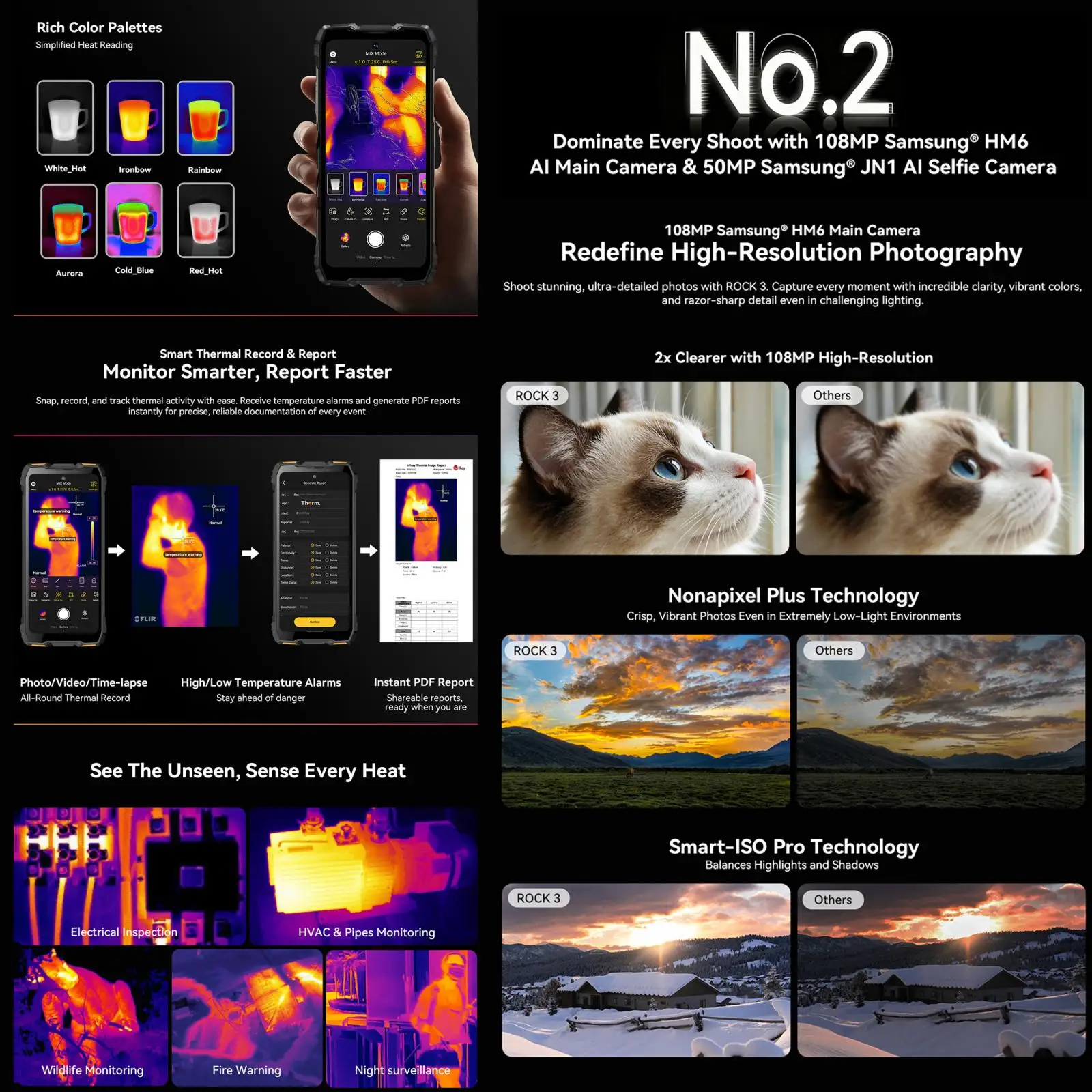 Blackview ROCK 3 оснащений однією з найпросунутіших систем камер у класі захищених пристроїв, що робить його незамінним інструментом для складних завдань. Головна зірка цього блоку — інтегрований тепловізор FLIR® Lepton 3.5. Це сенсор професійного рівня з роздільною здатністю 160x120 пікселів, що дозволяє бачити теплове випромінювання об'єктів. Завдяки технології MSX® (поєднання звичайного та теплового зображення), ви отримуєте чіткі контури предметів, що критично важливо для пошуку витоків тепла, діагностики електропроводки, перевірки систем опалення або виявлення живих об'єктів у повній темряві чи густому тумані.